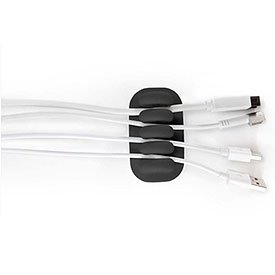 Five rubber grips with four slots, each of which can hold the ends of several cords Weighted base for stability Perfect for power cords, USB cords, cell phone chargers, audio cables, headphones, FireWire cords, and more. Small footprint (fits even the most cluttered workspaces) Ability to stack cables on top of each other within each loop.